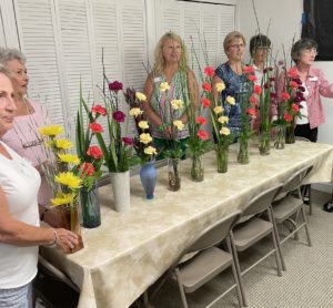 TGC members (left to right) Linda Lee, Mary Ruth Morgan, Wanda Taylor, Theresa Schehr, Jolene Martin, & Charlotte Miller display their line design floral arrangements after instruction.