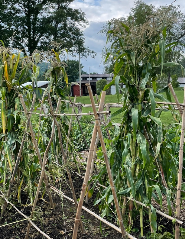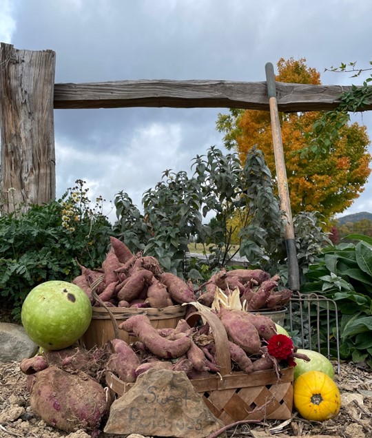 The Heirloom Kitchen Garden yielded a bountiful harvest for the TGC. In summer, we harvested potatoes, corn, and beans. Beans were picked for drying and stringing. Ears of corn dried indoors for later shelling and grinding for corn meal for winter. In early fall, pumpkins were picked and dried for cooking. Sweet potatoes were harvested, and our birdhouse gourds are curing on the vine. For our ancestors, nothing from the garden went to waste—even the spent plant materials.
